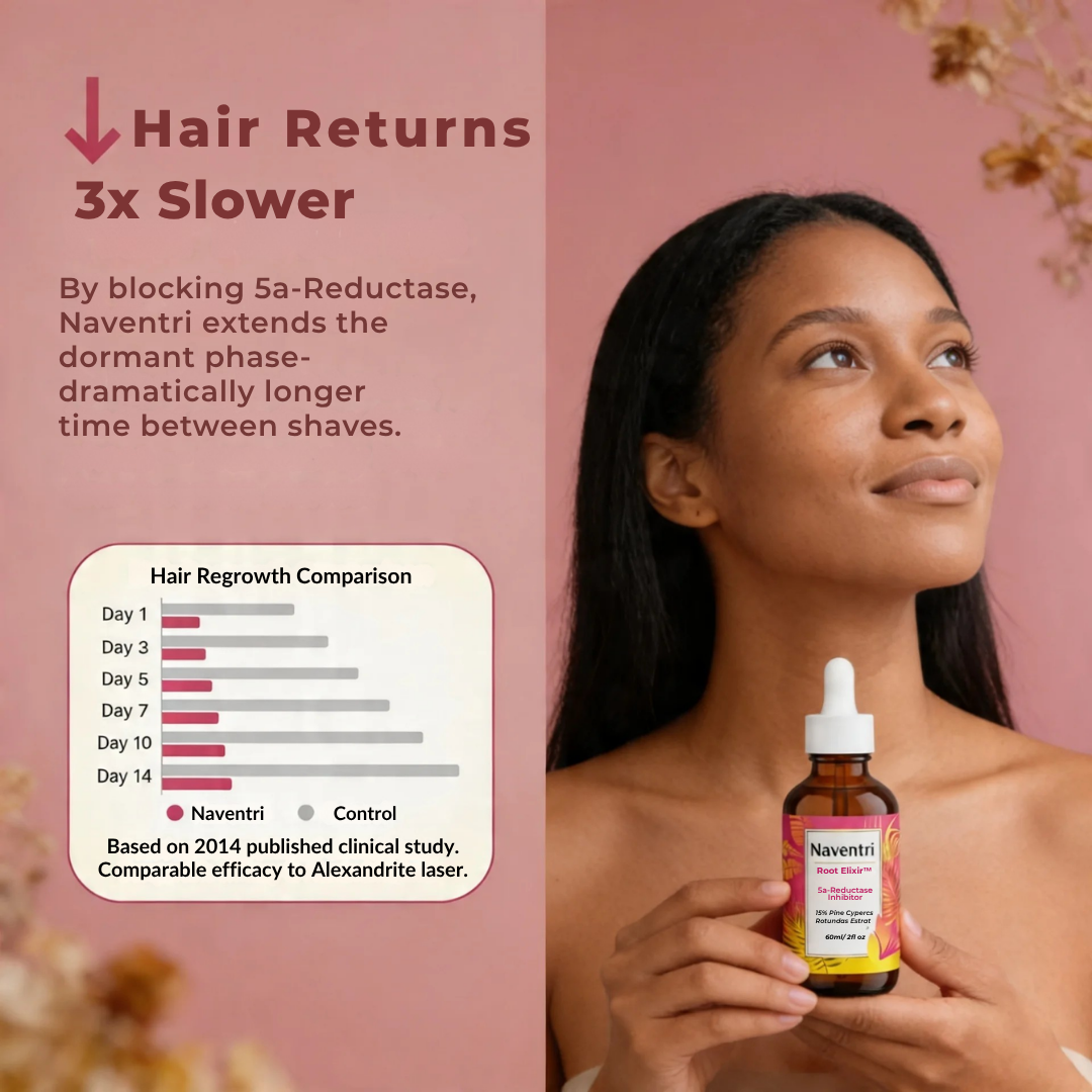 Targets the hormonal signal driving fast, coarse regrowth — the layer every razor, wax, and laser session has always missed.